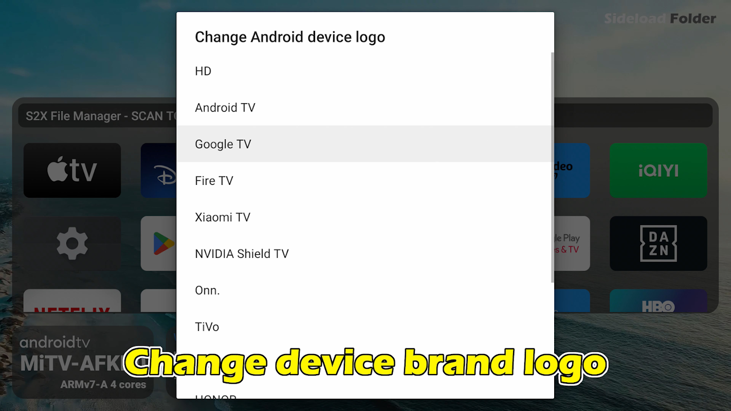 サイドロードアプリやその他のアプリ用のホーム画面フォルダーと TV ランチャー。