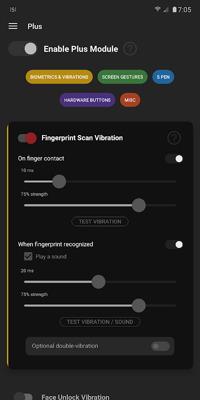 -Plusモジュールは、デバイスに応じて20以上の機能を追加します(指紋振動、指紋ロック解除アクション、顔/虹彩ロック解除振動、ナビゲーションジェスチャー振動、スライスジェスチャー、ダブルチョップジェスチャー、ステータスバーフリック、ロックスクリーントリプルタップジェスチャー、自動生体認証ロックアウト、偶発的なタッチ保護オプション、電源ボタンの長押し、音量大+電源ボタン、音量小+電源ボタン、音量ボタンロール(下から上および上から下)、デュアルボリュームボタン押し、2回押し、3回押し、Sペンボタンプレス、ダブルプレス、および長押し、Sペングローバルエアオーバーライド、Sペン挿入/取り外し)