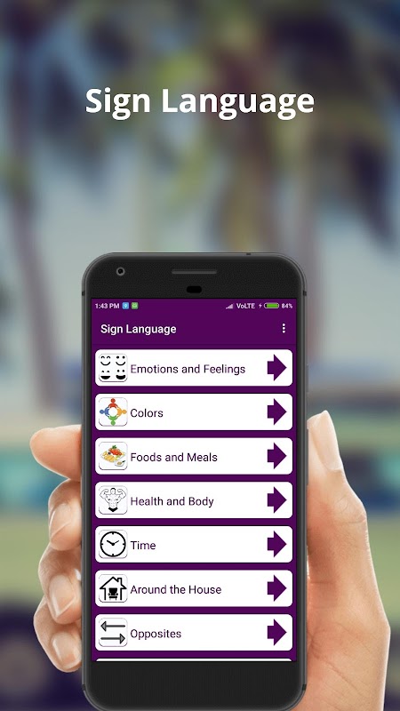 手話アプリは、アルファベットや数字などの基本から始まるさまざまなセクションに編成されています。セクションのリストには、挨拶、疑問詞、曜日と時刻、衣類、家族と人々、感情、色、食事、健康、反対、自然と天気、文の形成などが含まれています。
