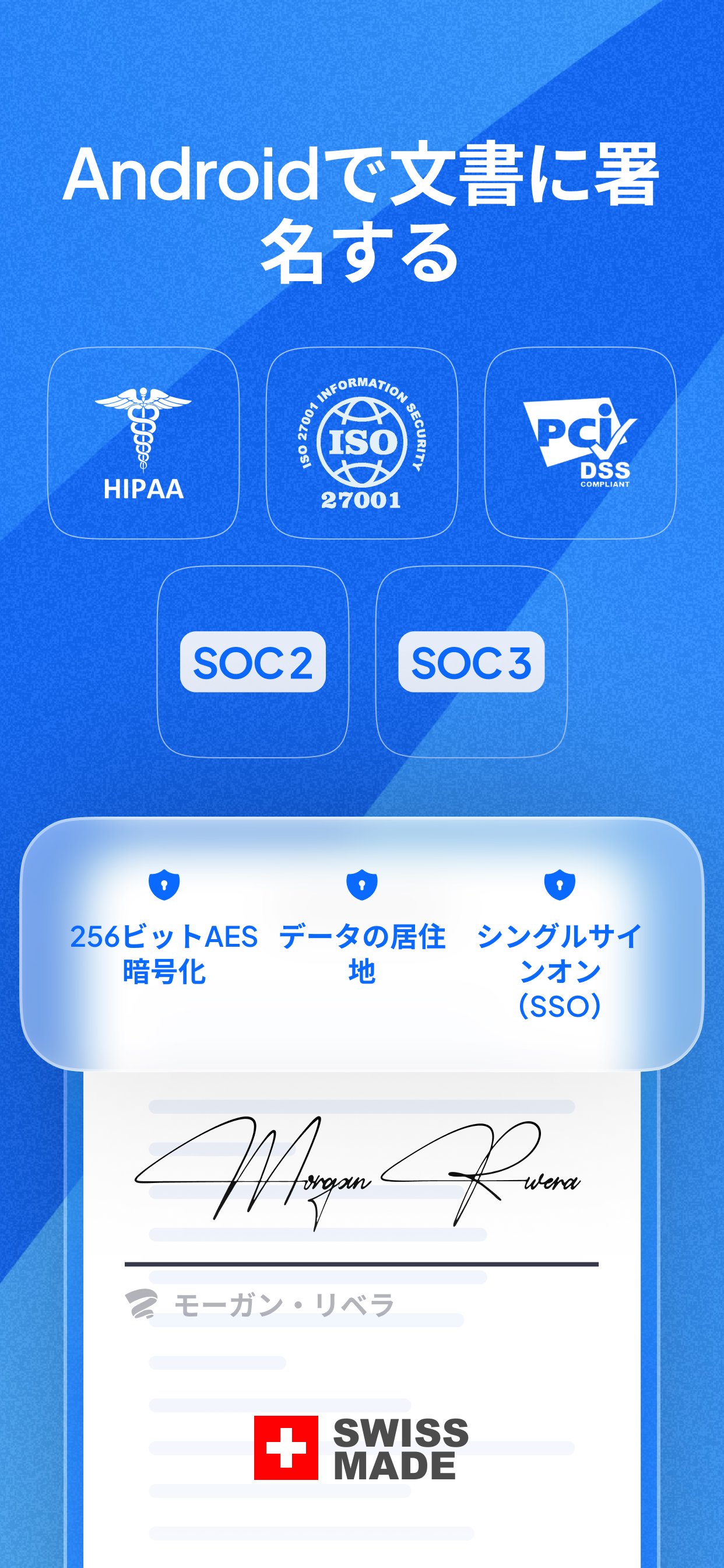 さまざまなコンプライアンス製品:SOC 2、HIPAA、ISO 27001、GDPR、CCPAなど、関連するすべての認証とコンプライアンスについて、自社と電子署名プラットフォームの認証に取り組んでいます。