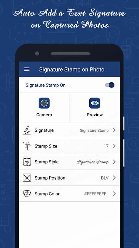 あなたのビルトインスマートフォンカメラで押された写真にテキストや単語を自動的に追加して、それらのすべてを大切にしているマークスタンプとマークアップとして永久に追加します。