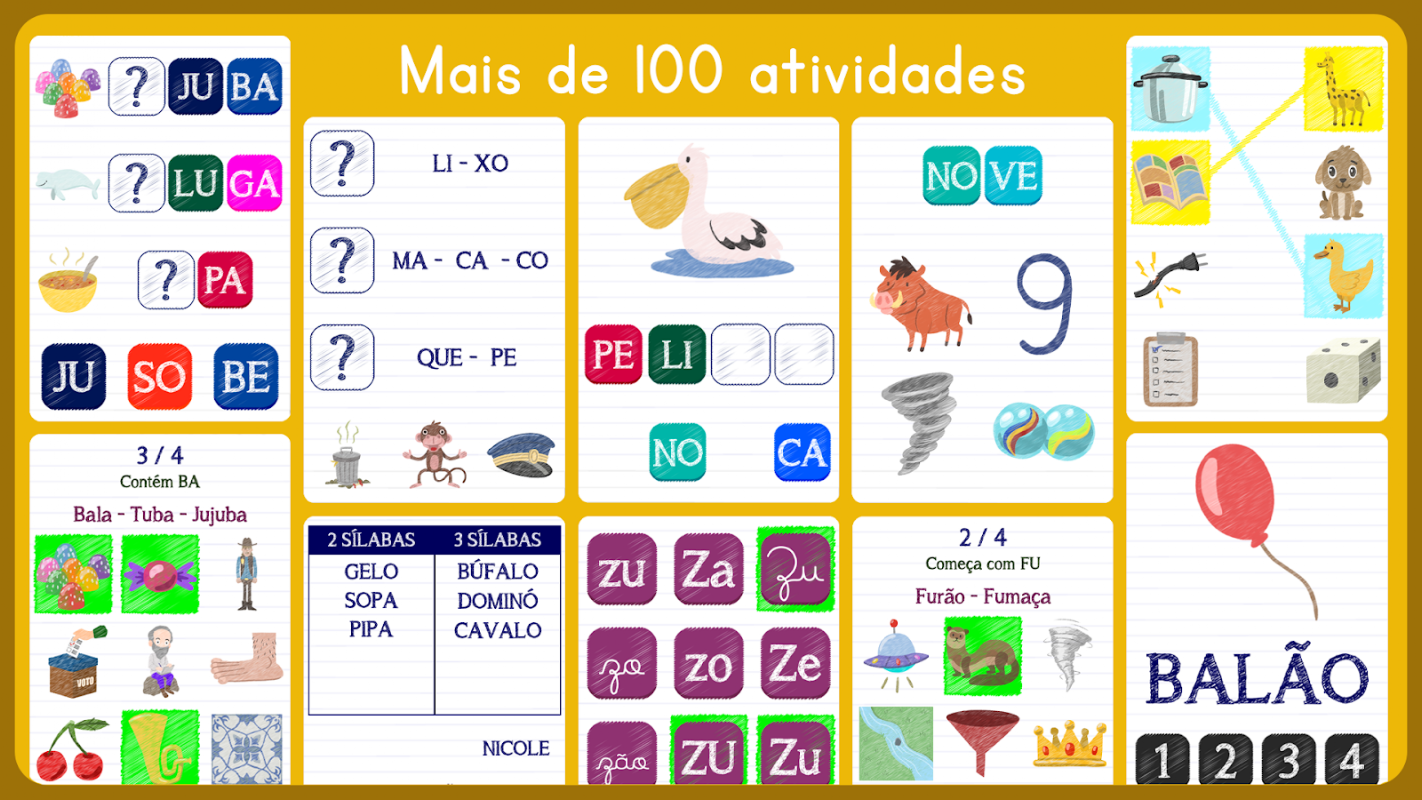 ゲームの主なアクティビティは、単純音節と複雑音節、またはすべての音節の組み合わせに分けられ、次のとおりです。