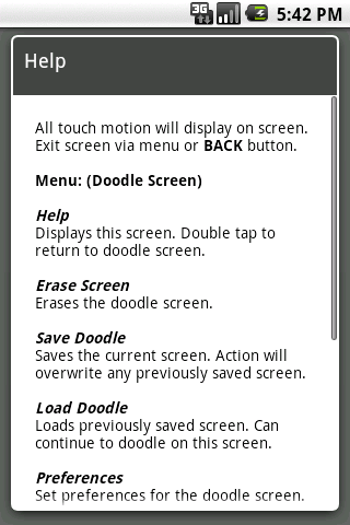 A doodle screen may be saved for later reload. Only one screen is saved (save will overwrite any previously saved screen). Orientation can be locked by a preference setting. Touch to draw point offset is also set as a preference.
