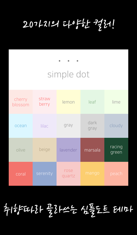 심플톡과 도트톡을 통합 업데이트 하면서 신규 컬러가 추가되었습니다. 총 20가지 색상의 다양한 테마를 즐겨보세요 :)