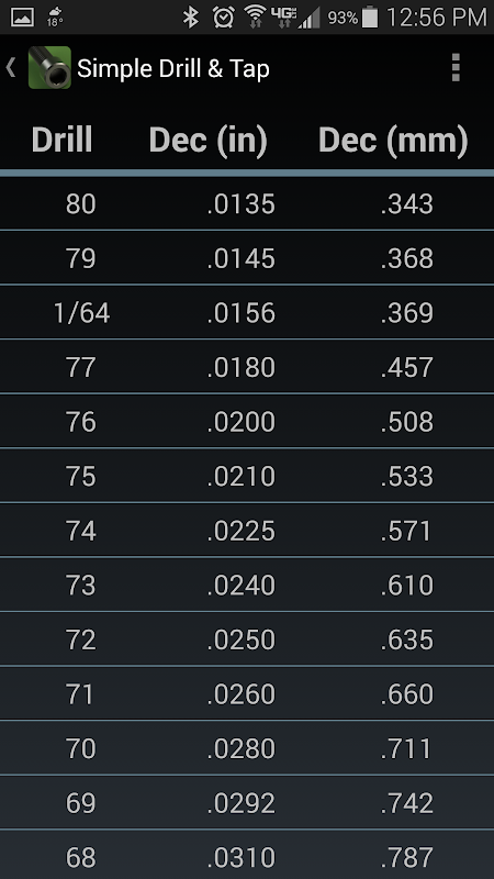 This app gives drill and tap tables for all common thread sizes including: United National Coarse, United National Fine, National Pipe Tapered, National Pipe Straight, Metric Coarse, and Metric Fine. The drill and tap tables show drill letters and decimal values.