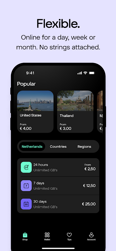 - 柔軟な期間:旅行や状況に合わせて、1日から数週間までデータバンドルを選択できます。バンドルの有効期限が切れるか、使い切った場合は自動的に停止します。縛りはなく、ご希望の場合のみ更新できます。