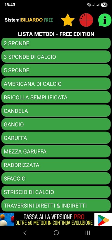 PRO版には60種類以上のゲームメソッドが搭載されています。イタリアンビリヤードとゴリツィアーナビリヤードの様々な戦略とテクニックを、それぞれのメソッドの詳細な説明とともに学ぶことができます。