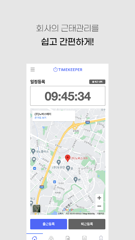 タイムキーパーは放送通信委員会から認証を受けたアプリで、モバイルアプリで出退勤管理や周辺情報を管理できます。
