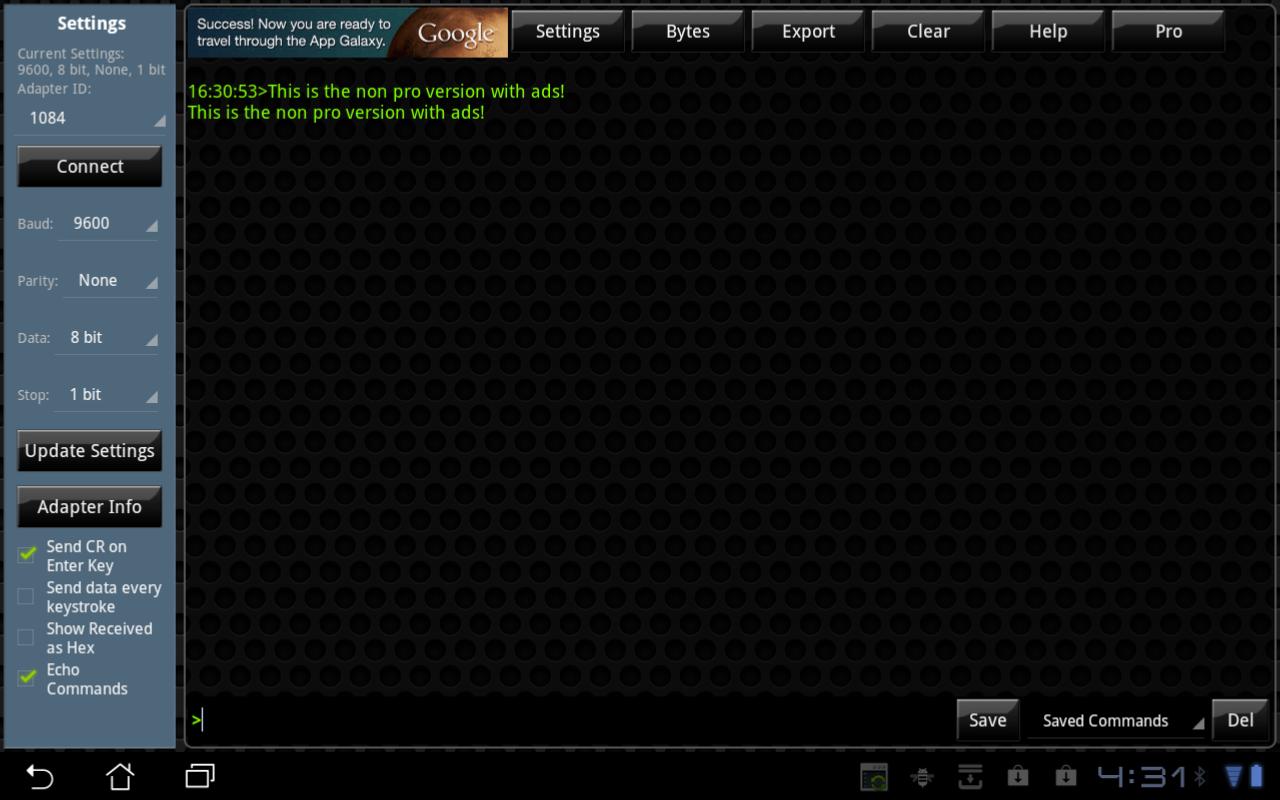 Slick USB 2 Serial Terminal allows you to use your tablet with your Prolific or FTDI based USB to Serial adapter and connect to your serial devices.
