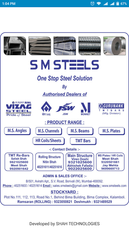 S M鋼の旅は1985年に長いバックを開始した、それはインドの鉄鋼供給を導入するための先駆的ブランドの一つです。ブランドは広く全国のディーラー、建築家、製造業者と建築業者全体の名声との認識を得ています。