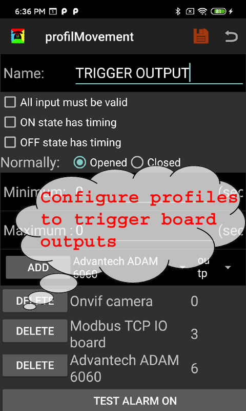 It will detect automatically ONVIF device such as camera on the local network. It has support for modern Ethernet IO board manufacturer through Restful communication and will configure automatically Modbus TCP devices. Then it can easily add the GSM capability (phone and text) in order to create an autonomous alarm coupled with phone internal sensor. Any device connected to the AlarmM application can trigger output to another device of different brand and on different network.