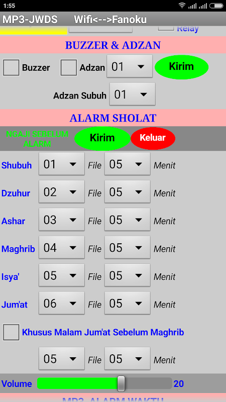 7. MP3----> fitur khusus untuk controller yang versi MP3. fitur : volume, file alarm sebelum