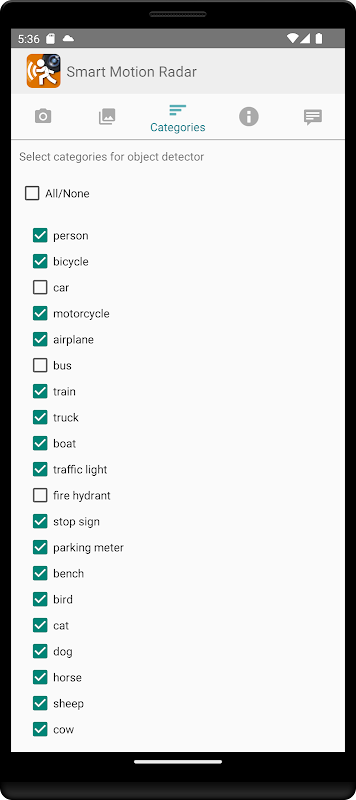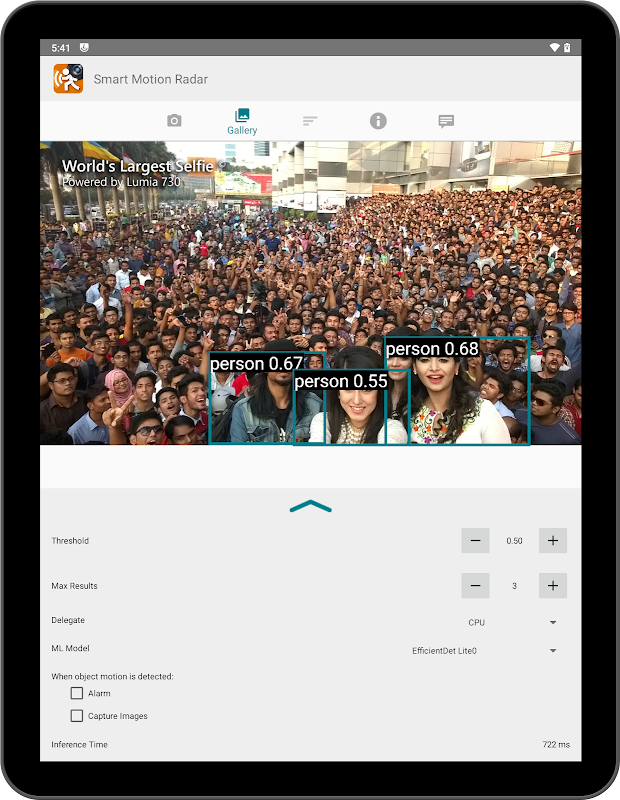 スマート モーション レーダーは、Android デバイスのカメラによって特定のオブジェクト カテゴリの動きを自動的に検出する、AI を活用したインテリジェントで使いやすいアプリケーションです。