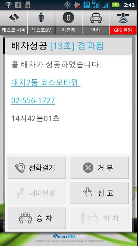 2.콜접수: MDT의 콜접수 기능과 동일합니다. 센터에서 배차정보를 받을 수 있습니다.