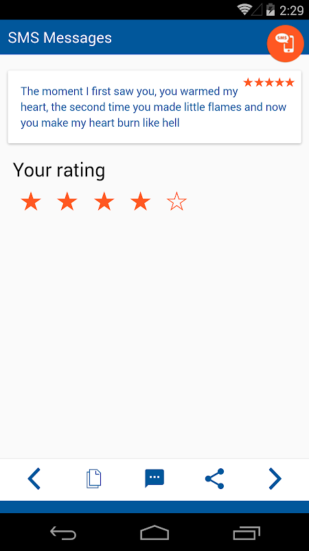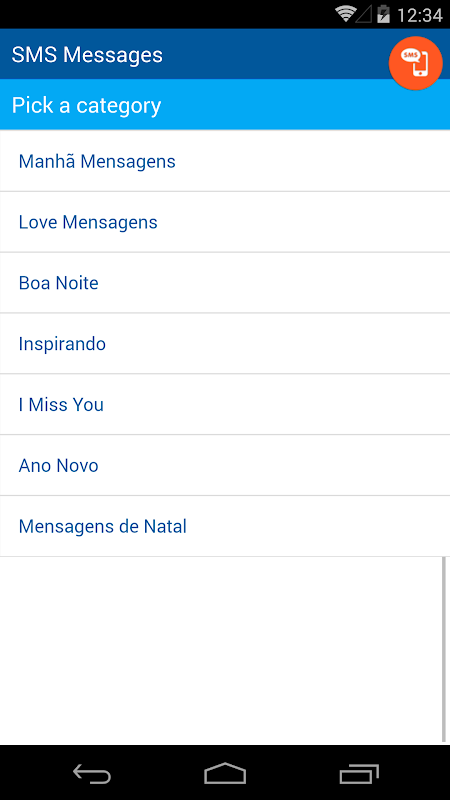 SMS Messages provides you with a SMS collection of thousands of messages divided into several categories. Once you've found a message that you like, with the touch of a button you can send that message through SMS / email or share it with your friends on Facebook, Twitter, etc.