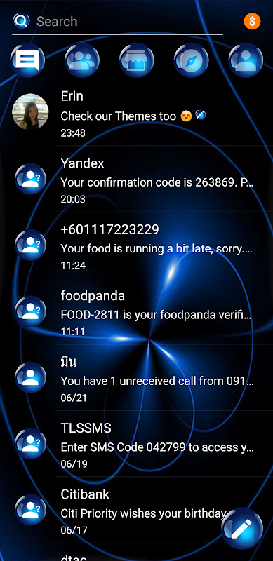 -SMSテーマ無料アプリを開き、[適用]ボタンをクリックします。各テキストメッセージは、このダークブルーのSMSテーマ無料の新しいカスタムデザインに置き換えられます。