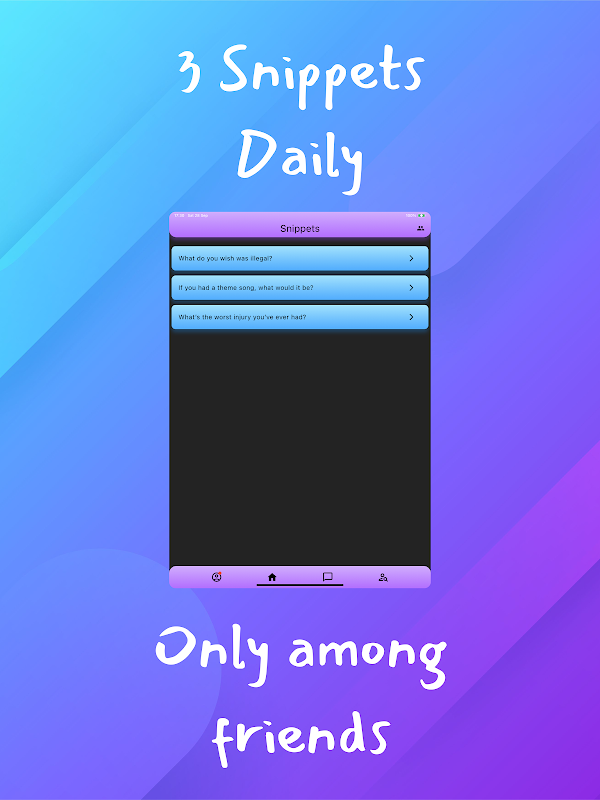 スニペットは、他のソーシャル メディア アプリとは異なる、まったく新しいソーシャル メディア アプリです。スニペットは、友人のみに表示されるランダムな質問を 1 日を通して行うことで、たとえそれがランダムなものであっても、友人についてもっと知ることができ、質問に対する他の人の答えについて真剣に議論できる環境を作りたいと考えています。スニペットの目標は、アプリを最も長く使用させたり、大量の広告を表示させたりすることではなく、ソーシャル メディアがいかに有益であるかを示し、友情を強化することです。
