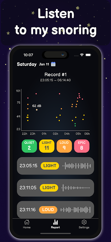 いびきを止めたい、睡眠の質を向上させたい、あるいは単に睡眠パターンを理解したいなど、どんな目的であれ、SnoreNoteは夜間の音を有益な睡眠情報へと変換します。