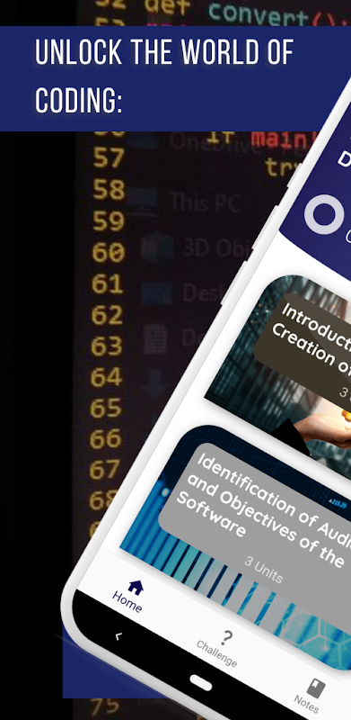 1. テーマ別ユニットで学習: 私たちのアプリケーションは、ソフトウェア開発ライフサイクル全体を網羅するテーマ別ユニットに編成されています。「ソフトウェア作成入門」から学習の旅を始めます。計画、設計、プログラミング、テスト、データ統合、セキュリティ、展開、収益化などの主要な段階を経て進歩します。