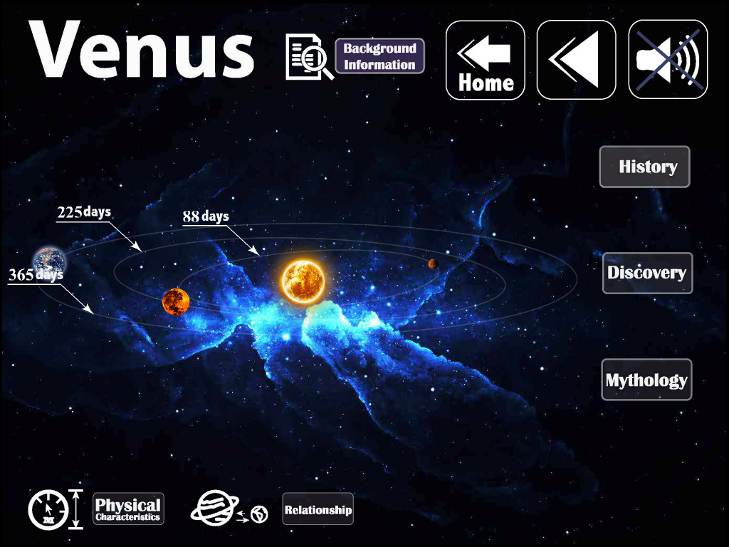 アプリケーションは、太陽系に興味がある一般の人々のためです。このアプリケーションは、美しいグラフィックとのナレーションが含まれています。内容は、惑星、歴史、発見、物理的特性と惑星の間の関係についての基本的な情報が含まれています。