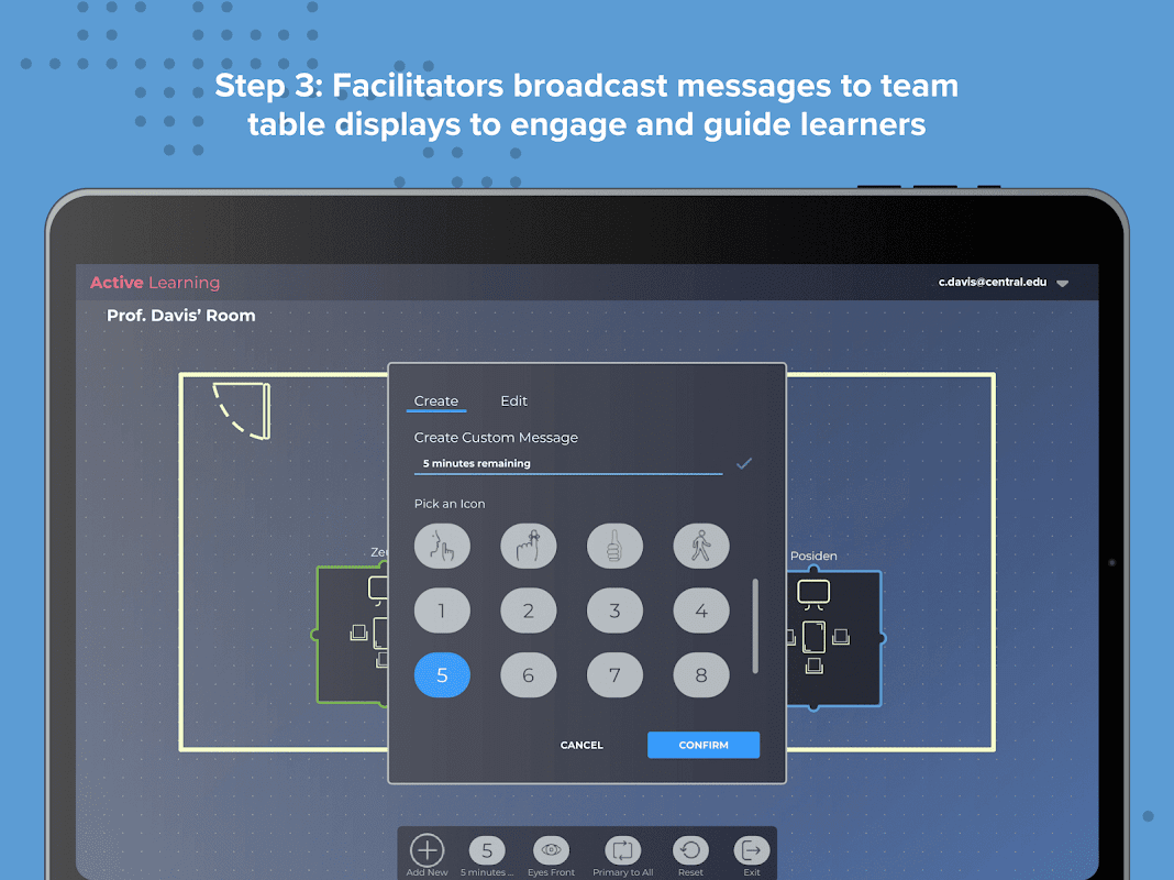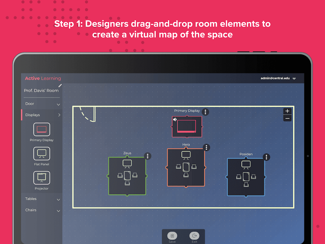 The Solstice Active Learning app features a drag-and-drop interface to allow admins and facilitators to virtually map the multi-screen environment and then easily route video and broadcast messages to team displays in real-time.