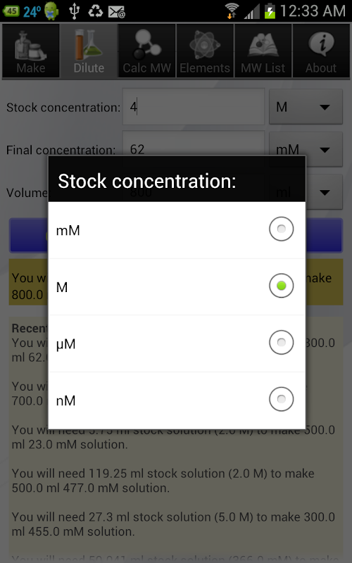 (1)これは、化学溶液を製造するための原液を使用して、ソリューションを希釈するための便利な計算機を有している。それはあなたがすぐにあなたが必要とするどのくらいの化学/原液を判断するのに役立ちます。あなたの電卓の周り混乱する必要はありませんし、あなたの勉強や研究に多くの時間を過ごすことができます。