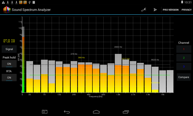 RTAの測定は、3つの別々のチャンネルに記録することができます。ユーザーは、後でチャンネル間のSPL(dB)の周波数応答のグラフを比較することができます。