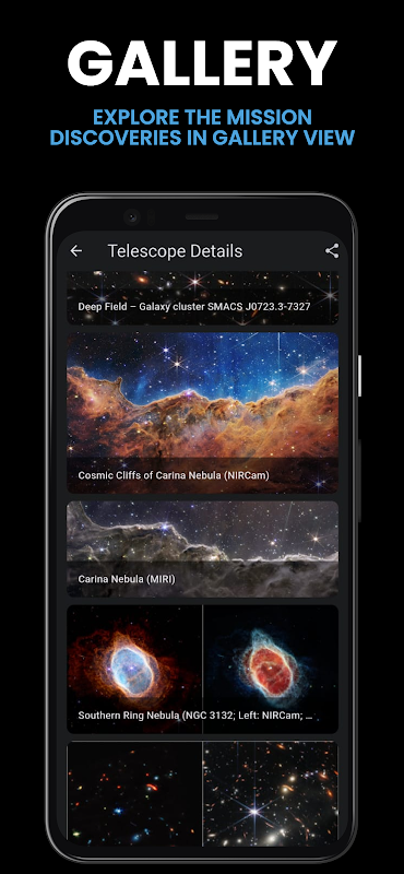 これらすべてに加えて、私たちのアプリには画像ギャラリーも含まれており、宇宙ミッションからの素晴らしい画像を探索して、宇宙の美しさと驚異を垣間見ることができます。