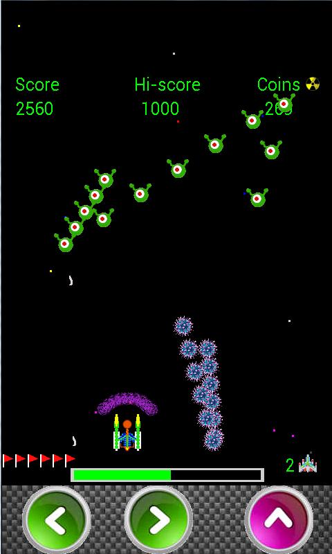 You start with a high powered blaster, no shields and are vastly out numbered. Your ship desperately needs upgrades, and you're in luck - collect the falling space money and visit the local weapons shop to get upgraded.