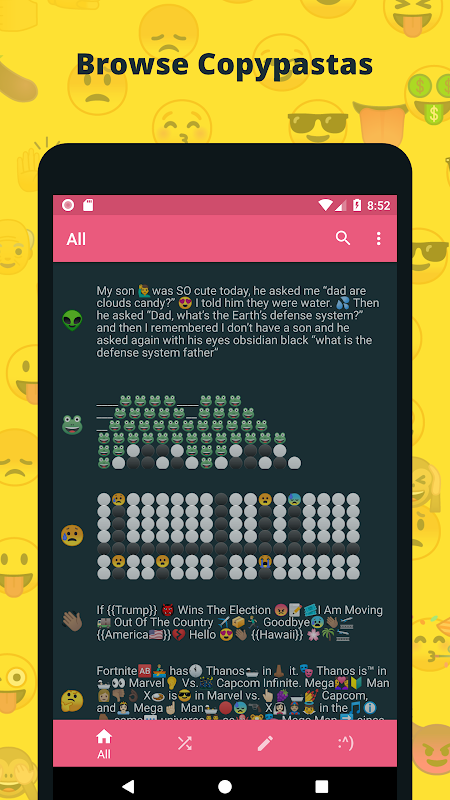 Spaghetti 🍝 is an app for those who enjoy copypastas 🍝😍 and emojipastas. 😐😍 Spaghetti makes it easy to browse, 📰 search, 🔍 copy, ©️ or edit ✏️ copypastas for you to share with your friends 😏