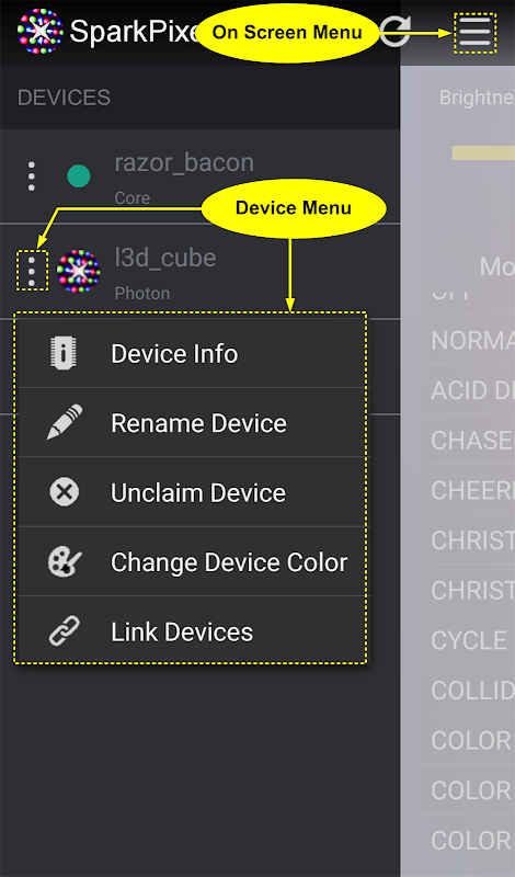 スパークピクセルは拡張可能です。独自のモードを作る - パーティクルのWeb IDEのスケッチにあなたのモードのコードを追加します。新しいモードを追加する方法については、githubのレポを参照してください。アプリでリロードアイコンをヒットし、魔法のモードリストに表示されるあなたの新しいモードを見ます。