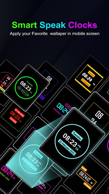 目覚まし時計のエクスペリエンスを向上させるは、1時間中音声時計として役立ちます。スマートスピーククロックアプリには、ロック画面用のボイスウォッチスクリーンセーバーが数十あります。アナログスピーククロックスマートアナログボイスクロックアプリのスマートデジタル時計アイコンをタップしてから、電話のスクリーンセーバーのスピークウォッチを設定します。スマートボイスクロックアプリには、50以上のスーパーデジタルスピーキング目覚まし時計があり、ユニークな色の組み合わせで、一見しただけですべてのユーザーを魅了します。さまざまな顔のデザインと魅力的なスピーキング目覚まし時計を備えたスーパーデジタル音声スピーキングクロックを使用してください。スマートボイスウォッチスマートスピーククロックアプリのアナログ時計アイコンをタップしてから、モバイルスクリーンセーバーにデジタルトーキング目覚まし時計を適用します。