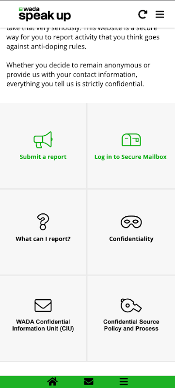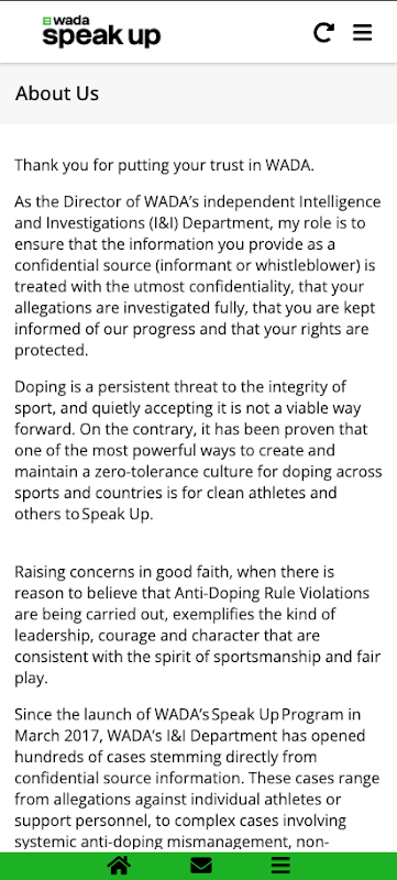はっきりしゃべって!アプリはドーピング違反を報告するための安全で機密な方法を提供しています。これは、世界アンチ・ドーピング機構(WADA)でのインテリジェンスと調査チームによって管理されています。このチームは、機密性を確保するためにWADA内で独立して動作します。
