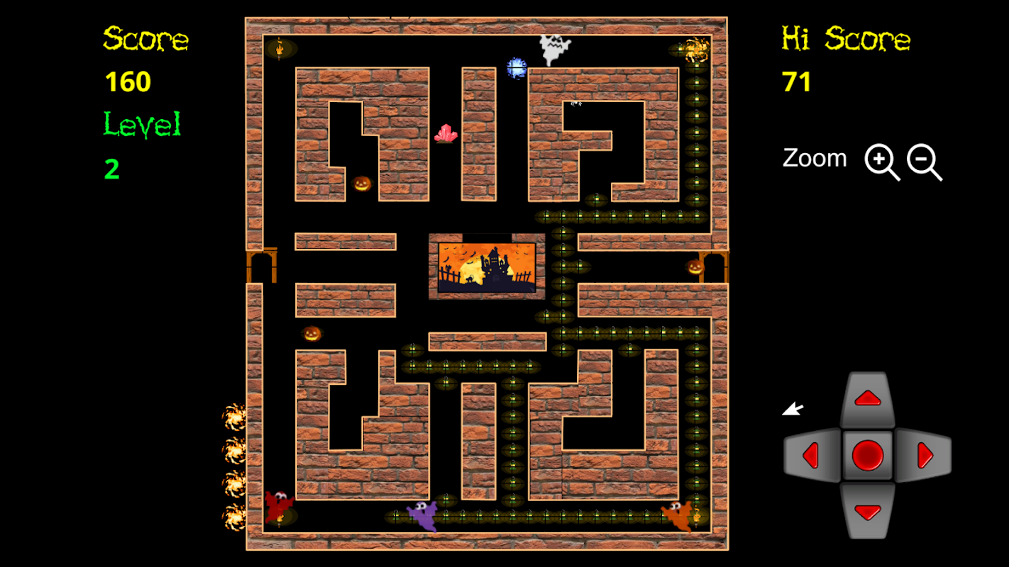 Light all the lamps in the maze to banish the spectres. Get the pumpkins to weaken the spectres, then chase them all. Get crystals for bonus points and hearts for extra lives. Make sure you get to ectoplasm before they do, or they will turn very nasty! Get to checkpoints to save your progress, zoom in for smaller mobile devices.