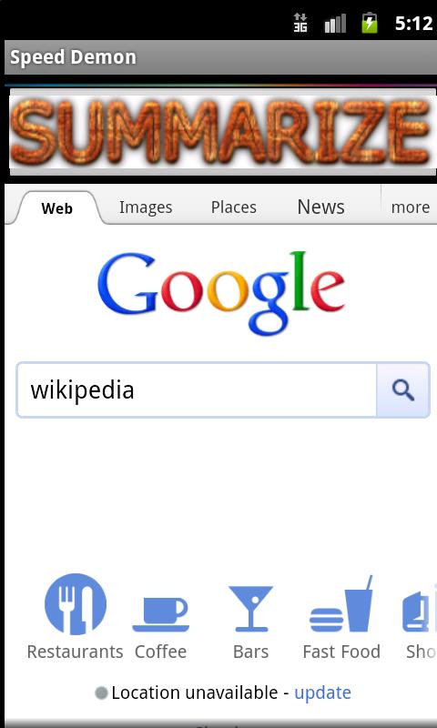 SPEED DEMON is the fastest mobile browsing experience ever. Navigate to a webpage and click summarize to view the main points of a page or article. Summarize any news or wiki article with ease. Need to read an article for school fast? Just click SUMMARIZE.