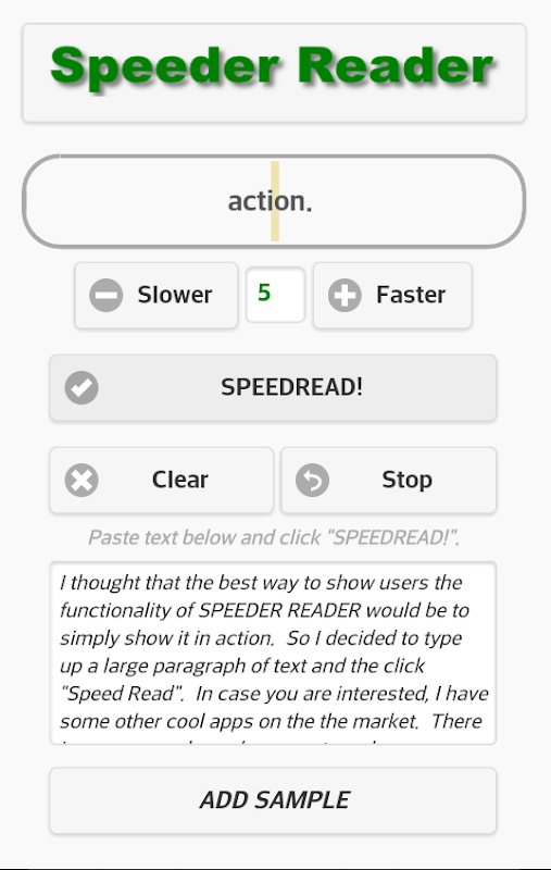 Simple app to let you Speed Read one word at a time to avoid the lag of moving eyes and changing lines. Just paste in the article you want to SpeedRead, choose your read speed, and go!
