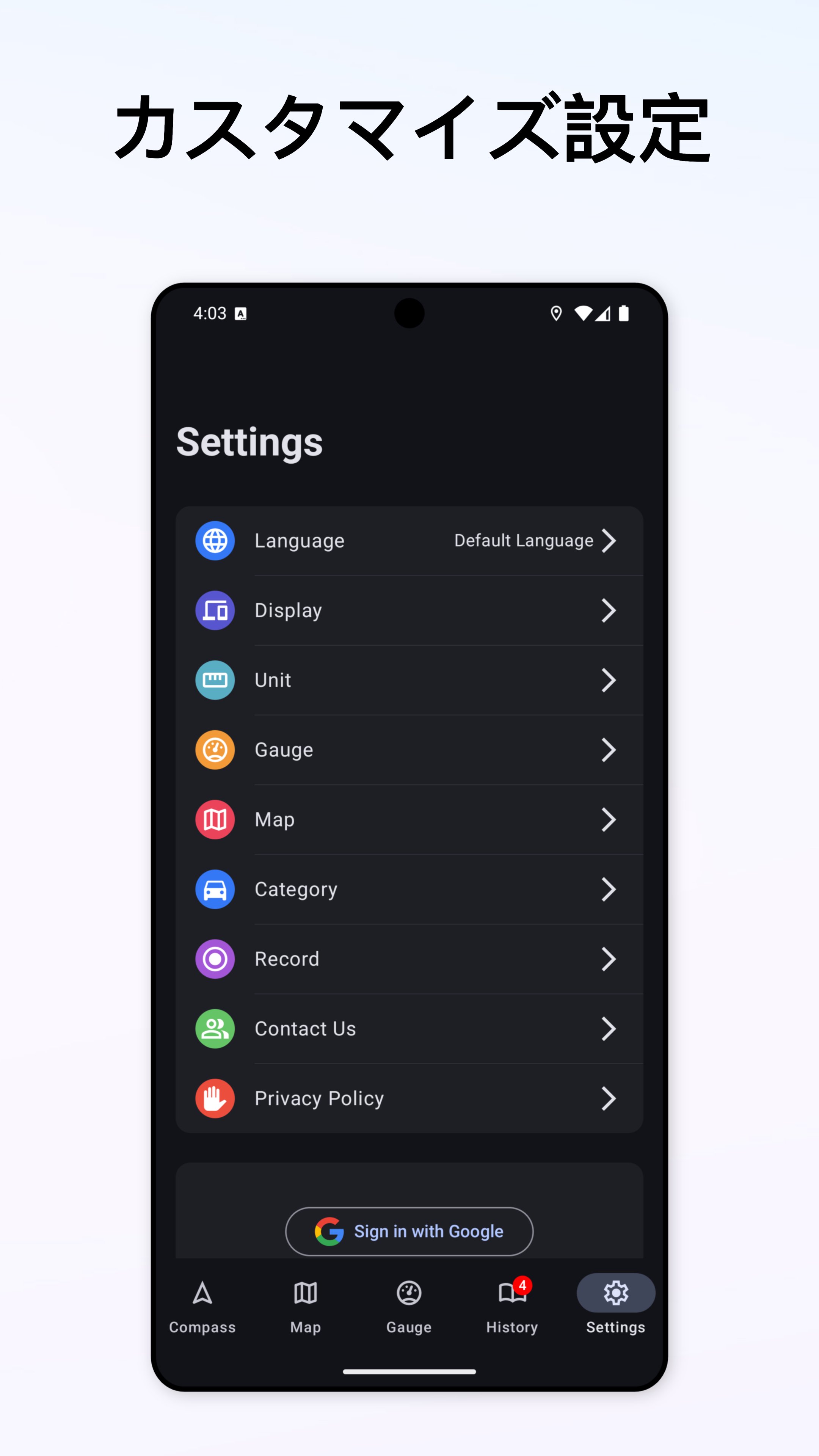 km/hとmphの切り替え、記録間隔、テーマ、地図スタイル、表示言語など、好みに応じて自由にカスタマイズ。