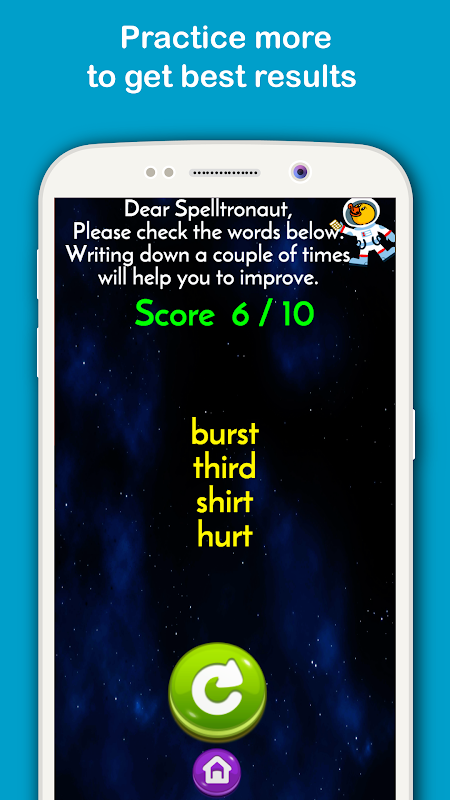 子供たちの学習は、さまざまな学年のグループに適した学習に焦点を当てているため、Spelltronaut : Primary Spellingゲームでは、単語が小学校の学年ごとにグループ化されています。プログラムは、用語ごとに色付きの行にグループ化された毎週のスペルリストに従います。子供たちがする必要があるのは、学校の学習と同じように毎週のスペルを選択し、自宅で自由に好きなときに勉強することだけです。毎週のスペルを選択すると、子供たちは単語のリストを表示し、毎週のスペルテストを開始する前に単語を勉強して学ぶ時間があります。ヒントを有効にすると、同音異義語または同音異義語を学習している場合に、スペルに役立つ例文が表示されます。最初は英語の単語を聞くのに苦労しても、もう一度英語の単語を聞くことができます。単語を入力し、チェックをクリックして、英単語が正しいかどうかを確認します。スペルを間違えると、正しいスペルが表示されます。スペリングテストの終わりに、子供たちは自分のスコアと間違いを見て、それらから学ぶことができます。より良いスコアを達成するためにもっと勉強してください。