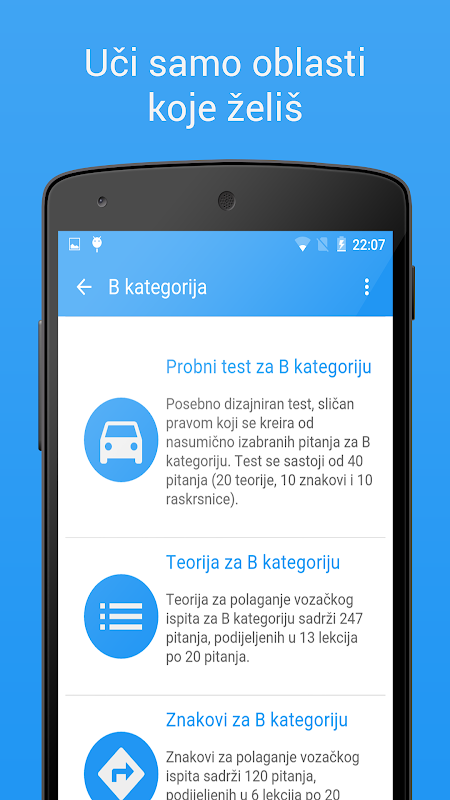 私たちは、発明し、A、BおよびCのカテゴリーの将来ドライバは迅速かつ容易に運転免許試験のためのテストに合格するために準備することができ、アプリケーションを開発しようとしました。簡単なナビゲーションを行うために、私たちが質問にグループ化されたので、あなただけの交差点、または単に兆候か、単に理論を学習に集中することができます。