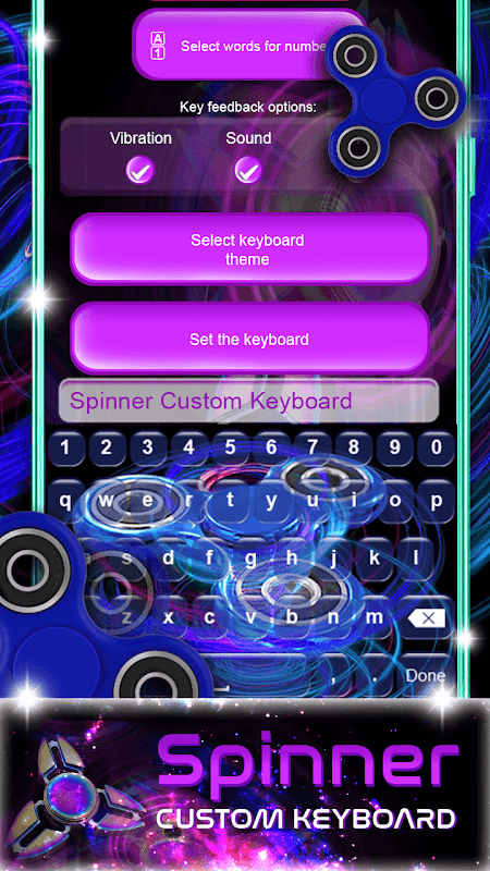 ✜ It's your time to shine, and there's no better way to do that then to use this amazing ✱ Spinner Custom Keyboard✱! Now you can adorn your keypad background by selecting colorful spinner images, cool keypad sounds, fonts and much more! Add your fave spinner wallpaper, select the key style you like the most and start a typing challenge! Now it's possible to type fast and accurate thanks to our built-in spell checker and auto-correction option. spinner games are conquering the app market, but don't underestimate “free keyboard apps” that are also inspired by these fantastic hand toys such as this one!