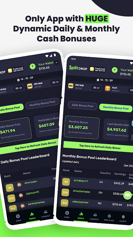- Bonus Cash: The only app with dynamic Daily and Monthly Leaderboards—more earnings for the top users