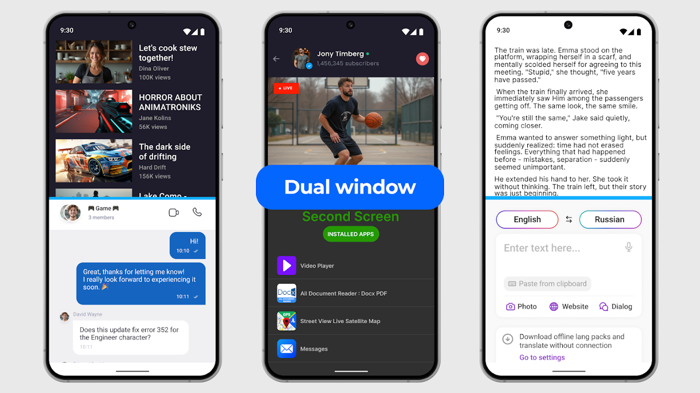 ウィンドウを閉じることなく、アプリを切り替えられます。分割画面デュアルウィンドウを使えば、仕事、エンターテイメント、コミュニケーションを並行して管理できます。もう邪魔されることなく、スムーズなマルチタスクを実現。分割画面デュアルウィンドウのパワーで、モバイルデバイスで真の効率性を体感できます。
