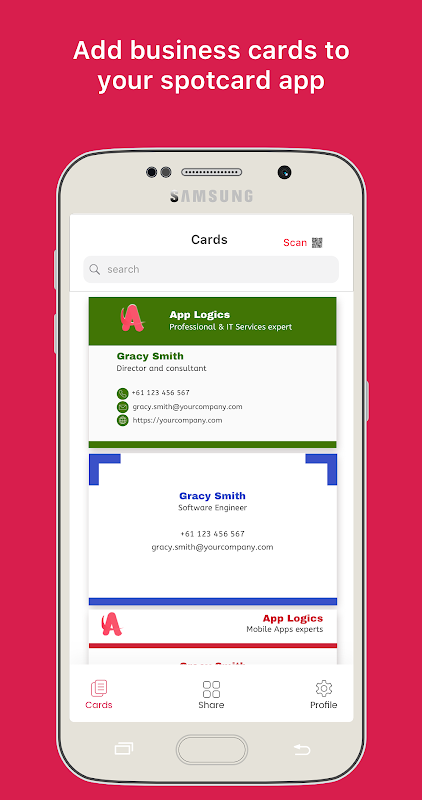 Spotcard apps allow users to create their own business card using pre-defined templates which can be shared easily with other Spotcard app users. We’ve made the business card sharing process digital.