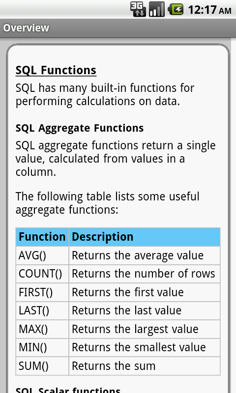 The SQL functions are categorized and searchable. Each function information screen contains a description, parameters, and plenty of