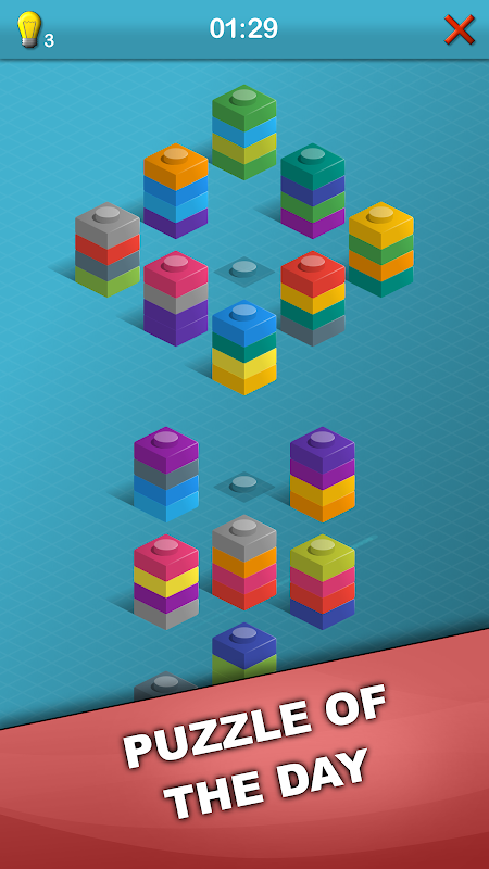 StackIt の遊び方は簡単ですが、マスターするには練習が必要です。最初は、さまざまな配置で積み上げられた色のブロックのセットがあります。同じ色のブロックをすべて重ねるまで、ブロックを動かします。そのためには、いずれかのスタックをタップして、一番上のブロックを別のスタックに移動します。唯一のルールは、同じ色のブロックの上、または完全に空のスタックの上にのみブロックを置くことができるということです。すべてのスタックが同じ色のブロックで構成されたら勝ちです。