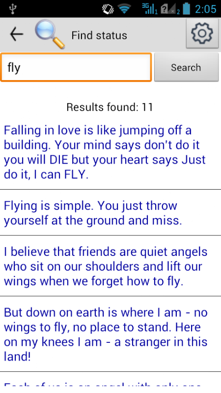 このアプリでは、Facebook、Twitter、VKontakteなどのサードパーティアプリでステータスを見つけて共有し、WhatsApp、テキストエディター、またはSMSを送信するためのアプリで使用できます。