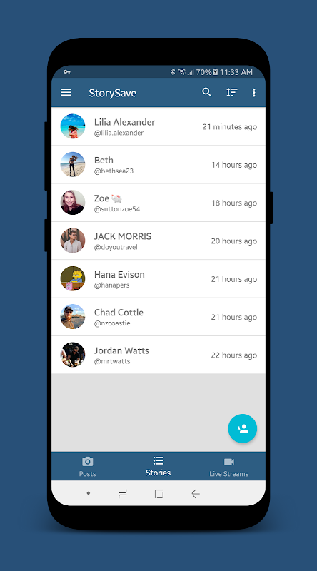 From there, you can see content of people that you follow on Instagram. If you want to save a Post, Story or Live Stream of someone you don't follow on Instagram, tap the search button in the toolbar to search Instagram users.