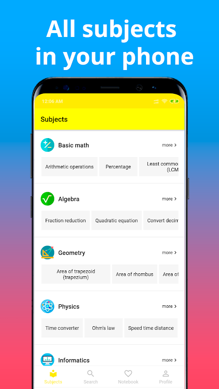 Study mate (home work cheat) includes 4 sections: calculators (calcs), formulas, theory and tables.