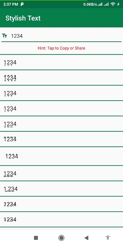テキストにスタイルを与えるには、最初のテキストフィールドにメッセージを入力するだけです。あなたのテキストは、以下のフィールドで別の派手なテキストスタイルに変換されます。好きなテキストのコピーボタンをクリックするだけで、好きな場所に貼り付けて使用できるようにコピーされます。