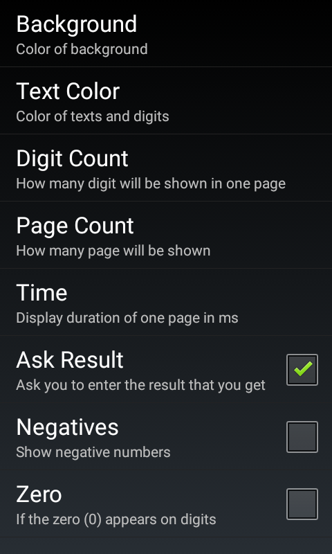 トレーニングの可能性は十分にあります。設定では、表示する桁数、ページ数、時間を設定できます。